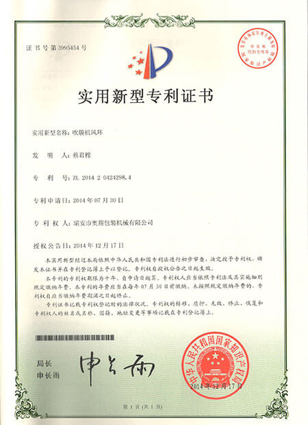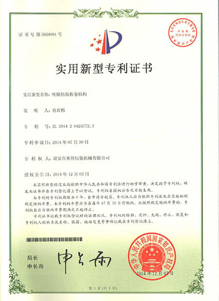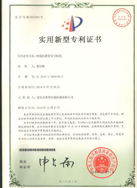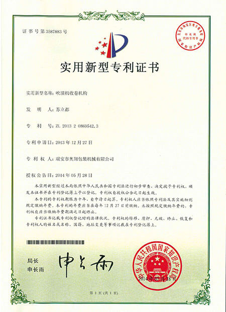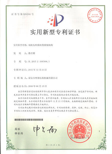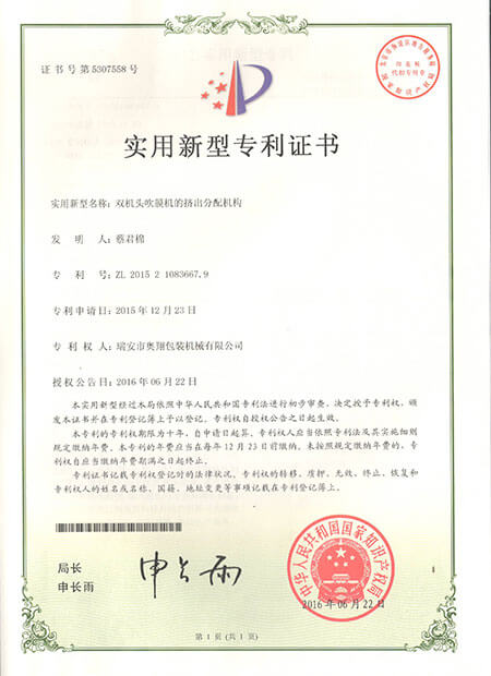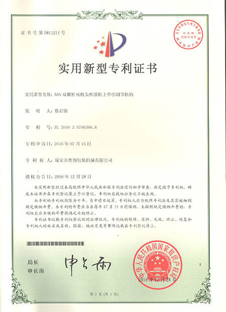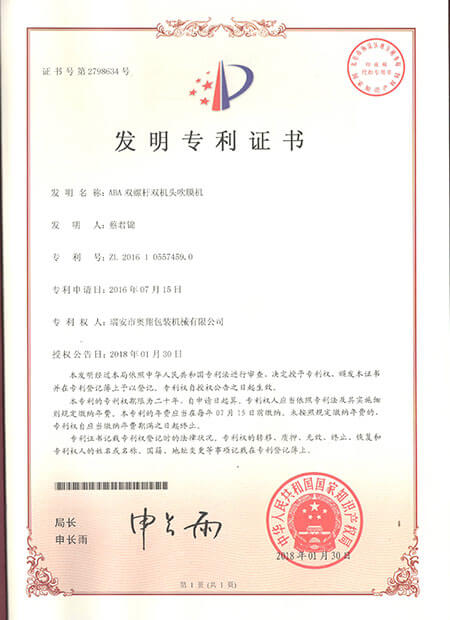 發(fā)明專利證書-ABA雙螺桿雙機頭吹膜機
