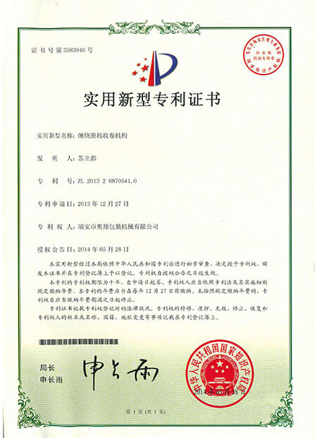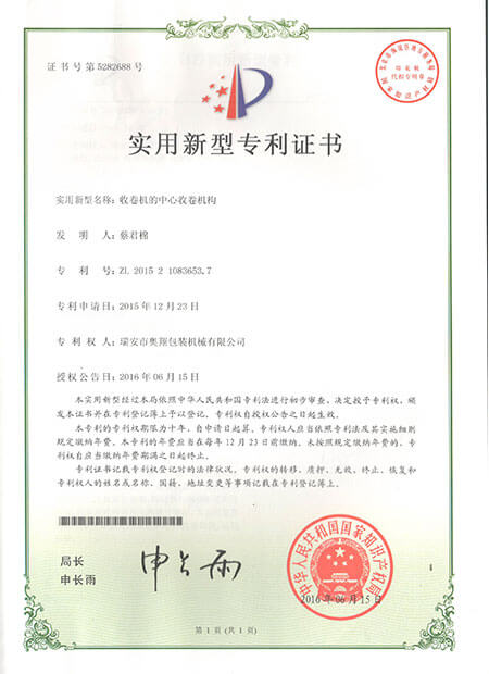 實用新型專利證書-纏繞膜機收卷機構(gòu)