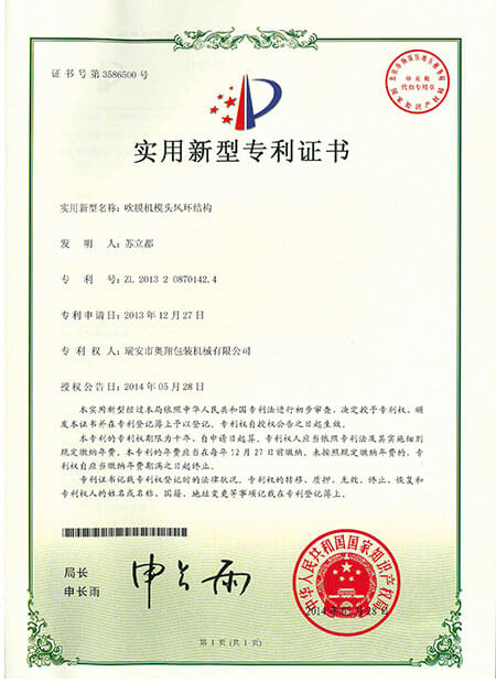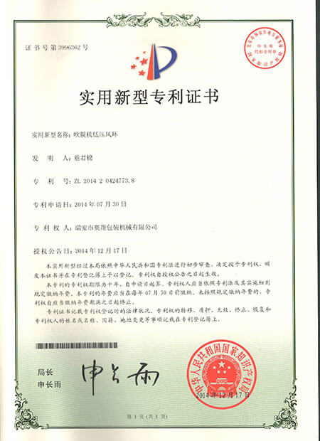 實用新型專利證書-吹膜機低壓風環(huán)