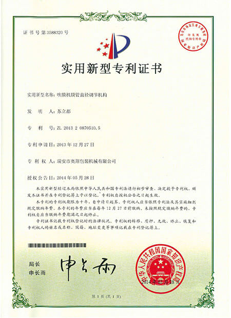 實用新型專利證書-吹膜機膜管直徑調(diào)節(jié)機構(gòu)