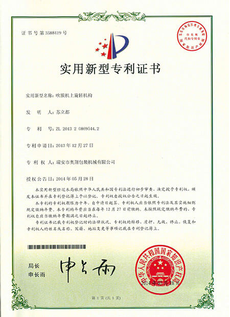 實用新型專利證書-吹膜機上旋轉(zhuǎn)機構(gòu)