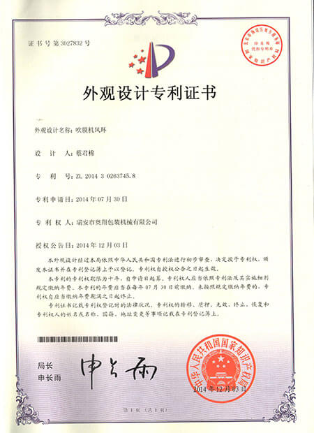外觀設計專利證書-吹膜機風環(huán)