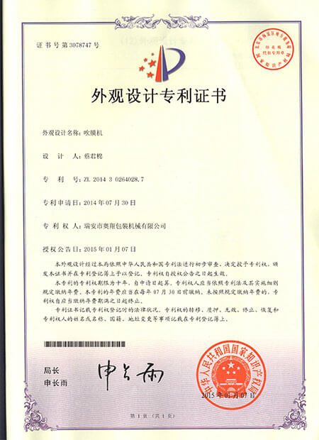 外觀設計專利證書-吹膜機