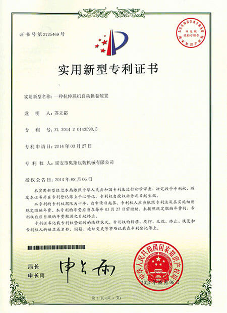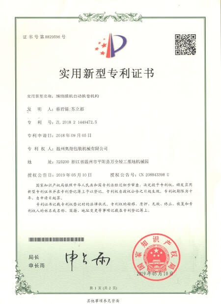 實用新型專利證書-纏繞膜機自動換卷機構(gòu)