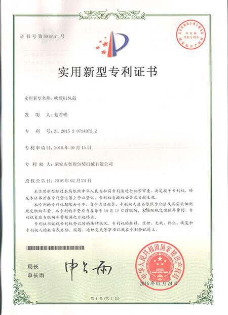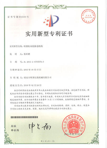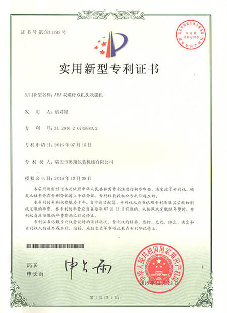 實用新型專利證書-ABA雙螺桿雙機頭吹膜機