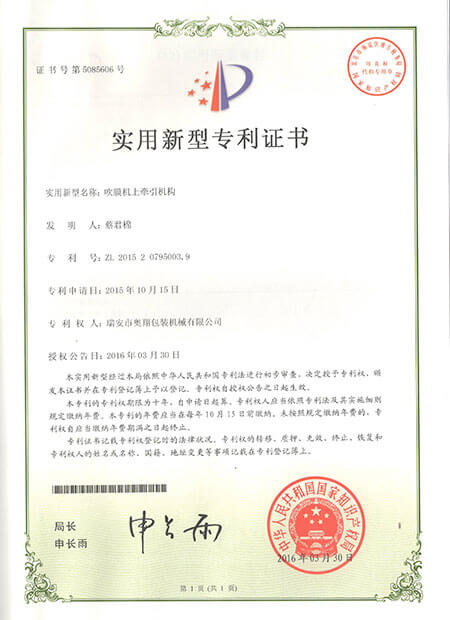 實用新型專利證書-吹膜機上牽引機構(gòu)