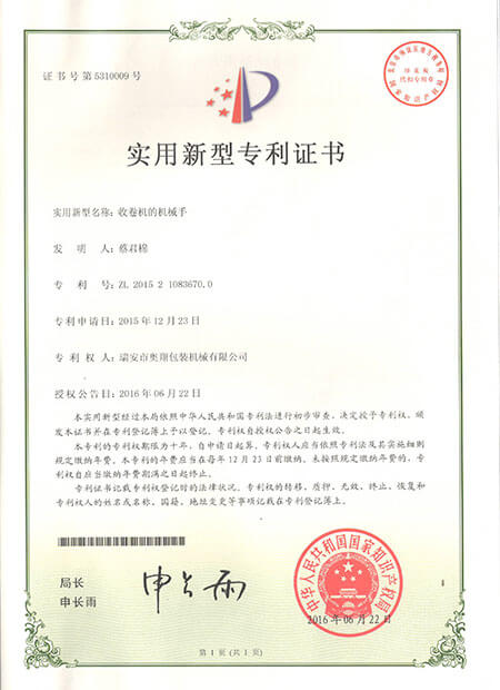 實用新型專利證書-收卷機的機械手