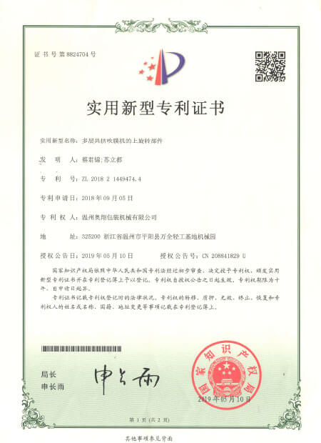 實用新型專利證書-多層共擠吹膜機的上旋轉(zhuǎn)部件